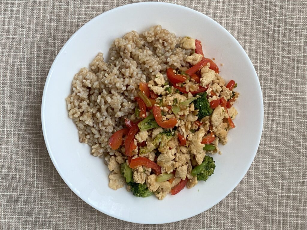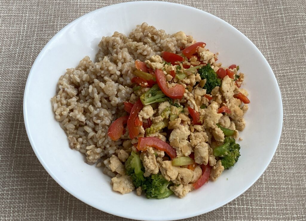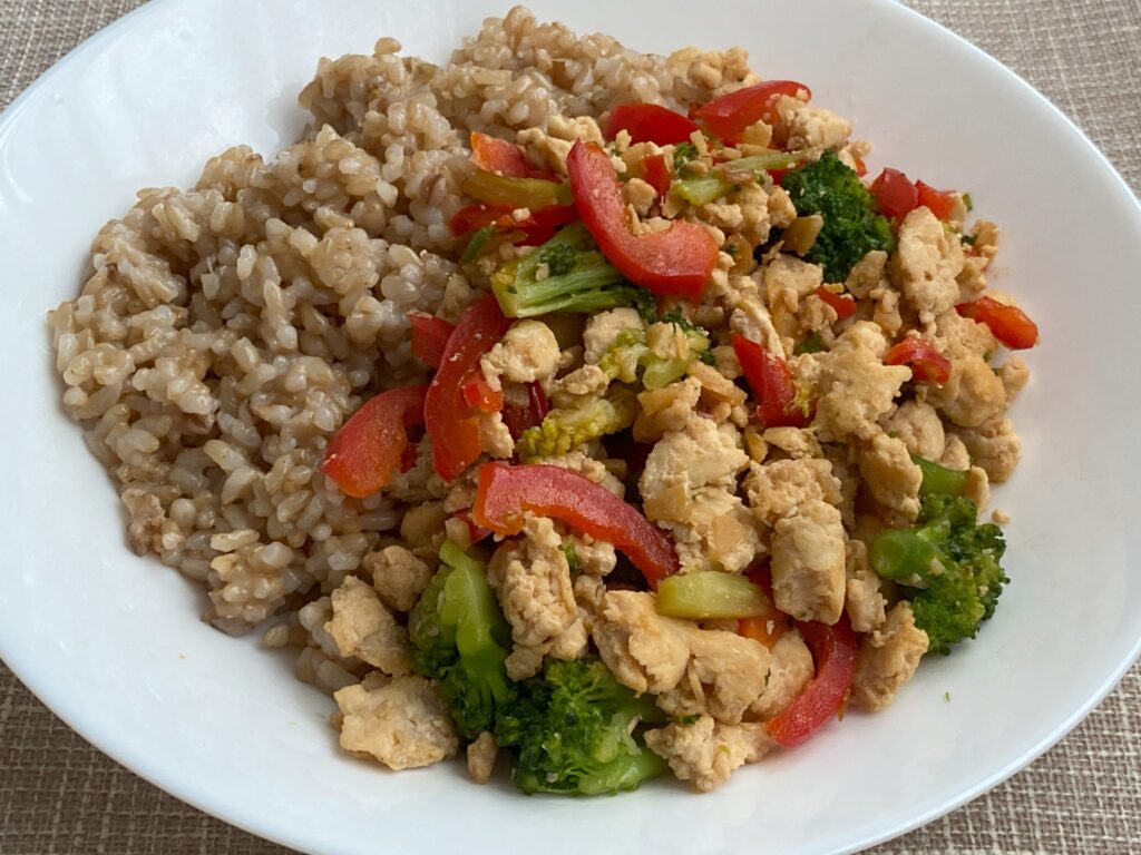 🍚調理の流れ:鶏むねひき肉を油で炒め、火が通ったら赤パプリカ、ブロッコリーをたれで炒め、器に盛った玄米に添える