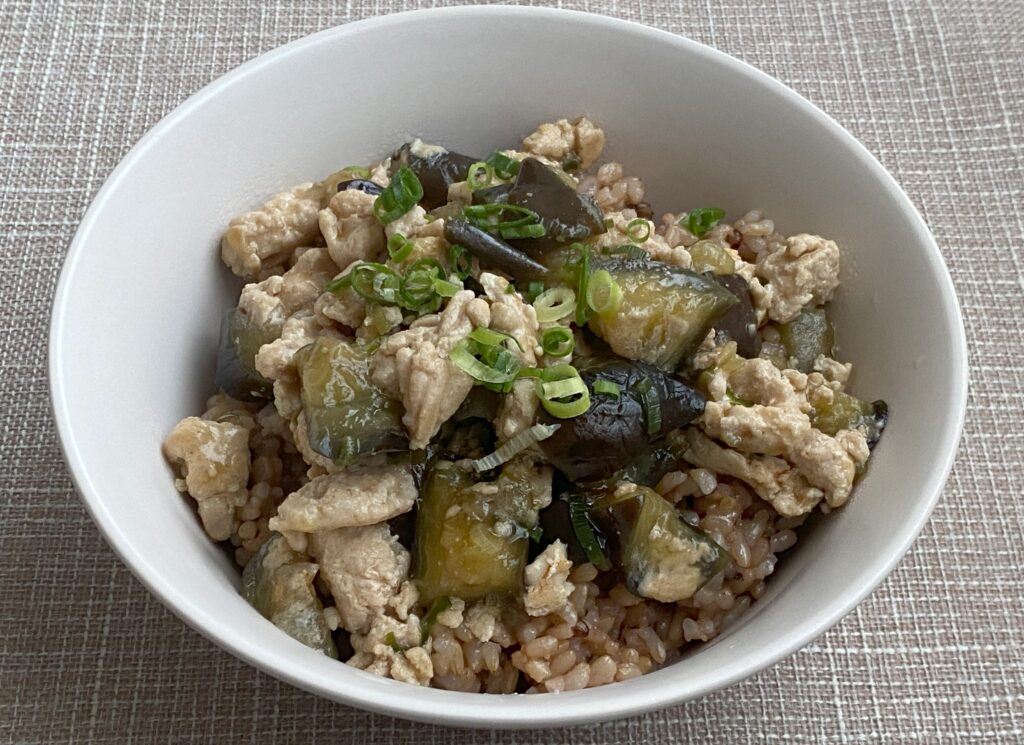 🍚調理の流れ:鶏ひき肉とナスを生姜と一緒に炒め、調味料で味付けしとろみを付ける器に盛った玄米にのせる。