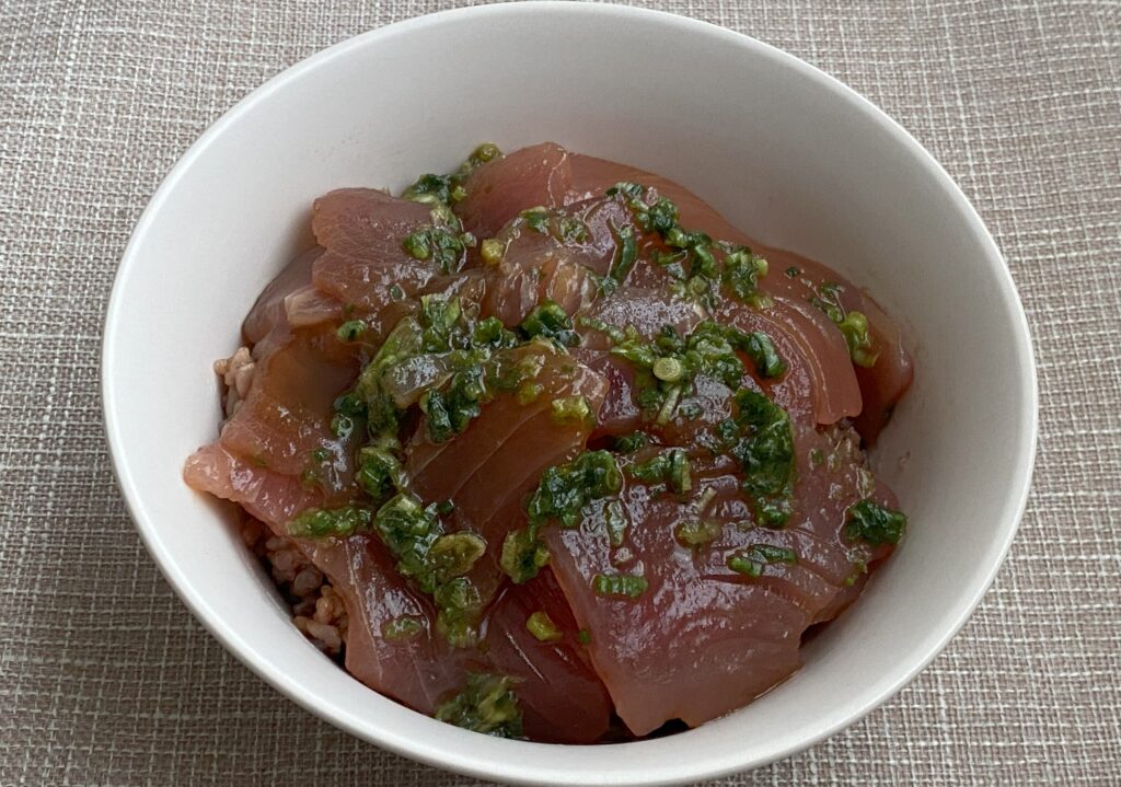 🍚調理の流れ:薄めの漬けダレにマグロを数分付け込み、器に盛った玄米にのせる