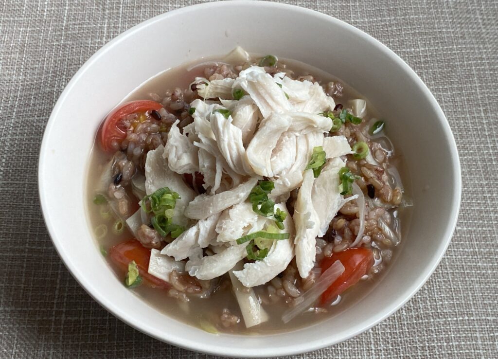 🍚調理の流れ:玉ねぎを鶏がらスープで煮込み、火が通ったら玄米・トマトを軽く煮込む。レンジで加熱したささみをさいてかゆの上にのせる。仕上げに少量のごま油で風味付け