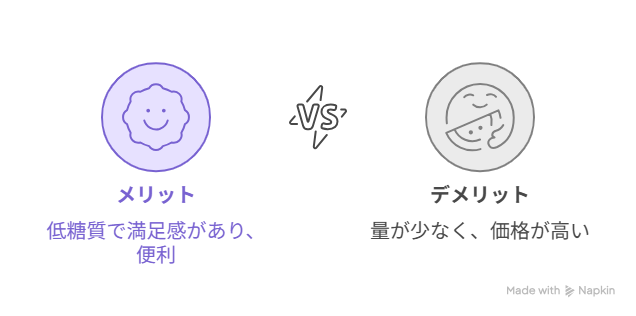 量の少なさや価格の高さがデメリットとして挙げられますが、「少しだけ甘いものを食べたい」「糖質を抑えても美味しく楽しみたい」というニーズには十分応えてくれます。