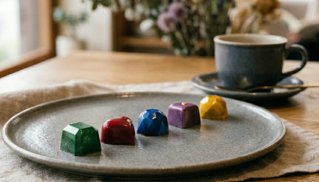 アオキ氏の作る「ボンボン ショコラ」は、まるでメイクパレットを広げたかのような鮮やかな色彩が特徴で、見た瞬間に心が躍り出します。細長いスティック状の形は、口の中でフレーバーの移り変わりをゆっくりと楽しめるよう設計されています。