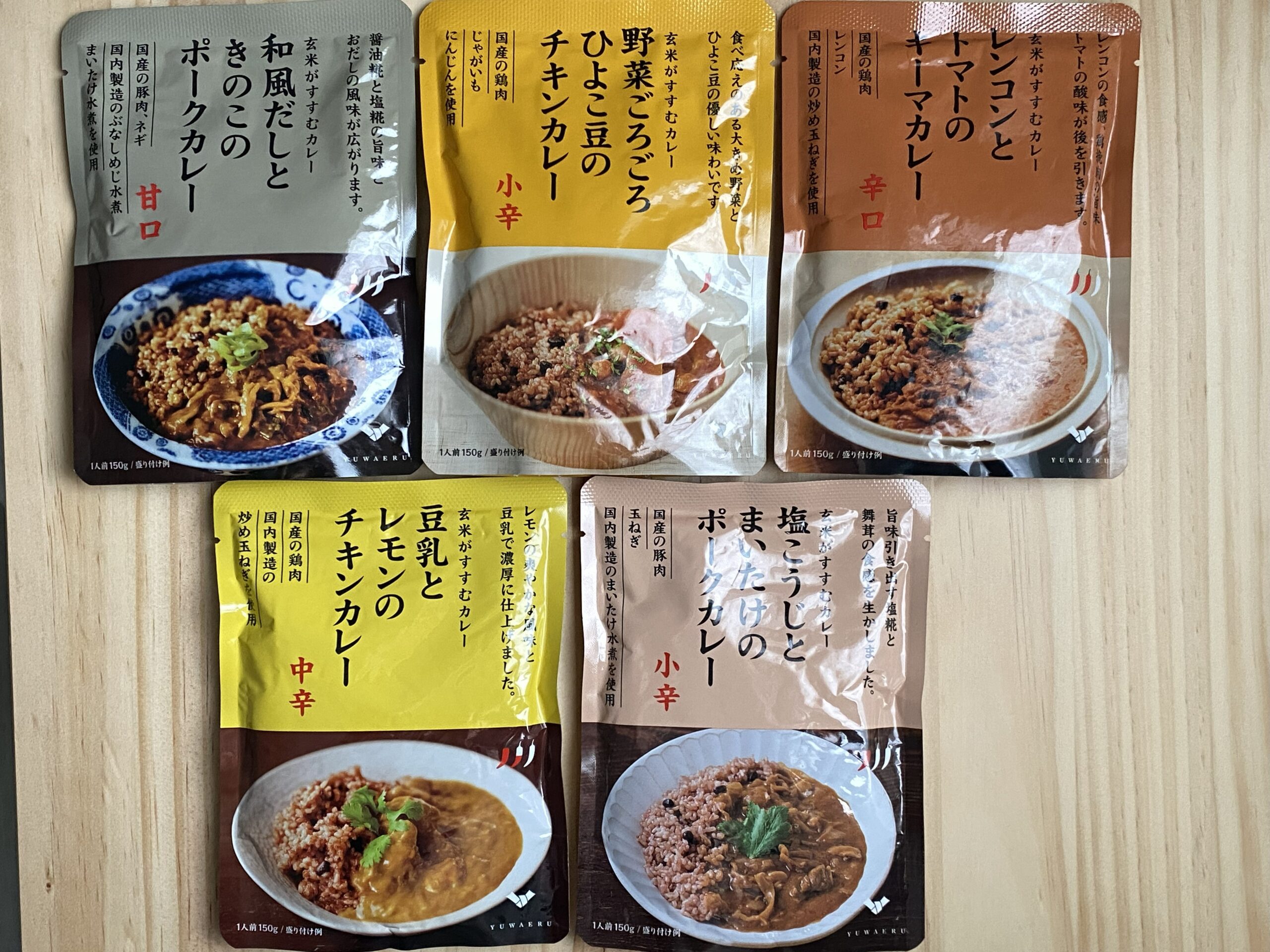 寝かせ玄米ごはんパックが6個とカレーが5個セットになっています。
